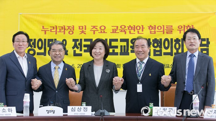 (서울=포커스뉴스) 심상정 정의당 상임대표가 20일 오후 서울 여의도 국회에서 전국시도교육감협의회와 간담회에 앞서 교육감들과 기념촬영을 하고 있다. 왼쪽부터 민병희 강원도교육감, 이재정 경기도교육감, 심 대표, 장휘국 전국시도교육감협의회장(광주시교육감), 조희연 서울시교육감.
