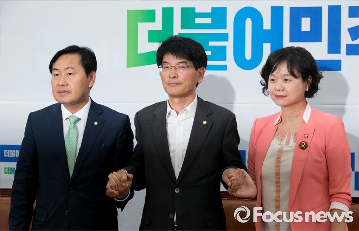 (서울=포커스뉴스) 야3당 원내수석부대표가 20일 오후 서울 여의도 국회에서 현안 관련 회동에 앞서 취재진을 향해 포즈를 취하고 있다. 왼쪽부터 김관영 국민의당 원내수석부대표, 박완주 더불어민주당 원내수석부대표, 이정미 정의당 원내수석부대표.