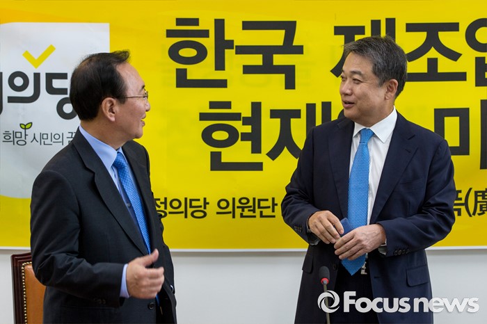 (서울=포커스뉴스) 노회찬(왼쪽) 정의당 원내대표와 정진행 현대자동차 사장이 21일 오전 서울 여의도 국회에서 열린 '정의당 광폭경청'에 참석해 대화 하고 있다.