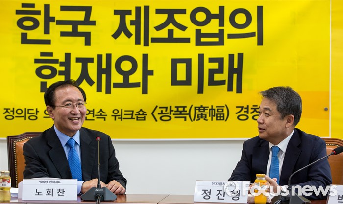 (서울=포커스뉴스) 노회찬(왼쪽) 정의당 원내대표와 정진행 현대자동차 사장이 21일 오전 서울 여의도 국회에서 열린 '정의당 광폭경청'에 참석해 대화 하고 있다.