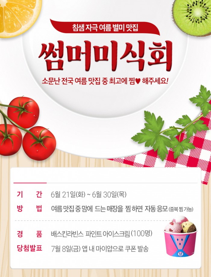 얍은 이벤트 참가자 중 추첨을 통해 100명에게 배스킨라빈스 파인트 기프티콘을 증정할 예정이다. 당첨자 발표는 7월 8일 진행 되며, 쿠폰은 '마이 얍' 탭에서 확인할 수 있다. 썸머 미식회를 통해 가장 많은 찜을 받은 매장은 얍(YAP)공식 블로그를 통해서 발표할 예정이다.