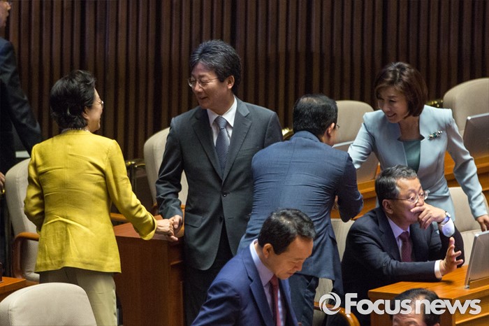 (서울=포커스뉴스) 유승민(오른쪽 두 번째) 새누리당 의원과 나경원(오른쪽) 새누리당 의원이 21일 오전 서울 여의도 국회에서 열린 본회의에 참석해 동료 의원들과 인사 하고 있다.