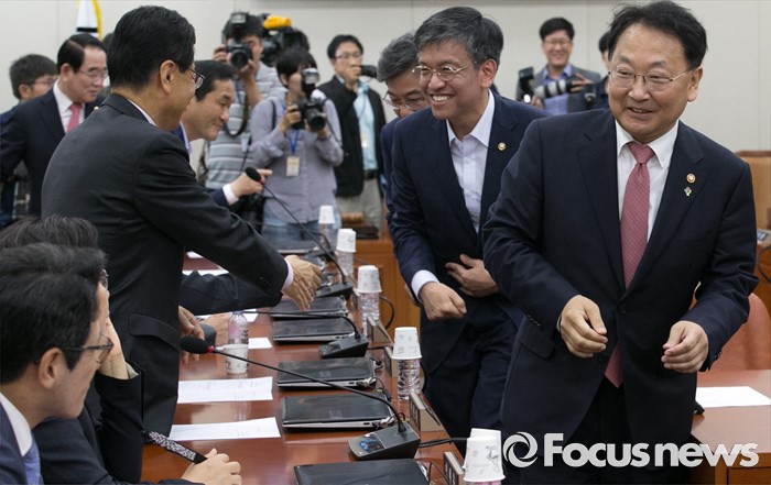 (서울=포커스뉴스) 21일 오전 서울 여의도 국회에서 열린 기획재정위원회 전체회의에 참석한 유일호 경제부총리 겸 기획재정부 장관이 의원들과 인사하고 있다.