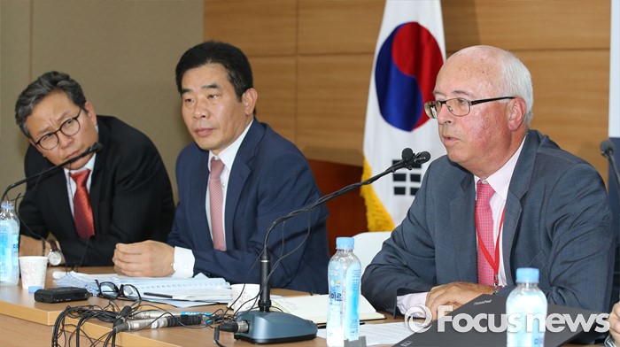 (세종=포커스뉴스) 장 마리 슈발리에(오른쪽) 프랑스 파리공항공단자회사 ADPi 수석엔지니어가 21일 오후 세종시 정부세종청사 국토교통부 브리핑실에서 열린 동남권 신공항 타당성 검토 연구 최종 보고회에서 입지선정 결과 발표를 마치고 취재진의 질문에 답변하고 있다. 왼쪽부터 손명수 국토부 공항항행정책관,서훈택 국토부 항공정책실장.