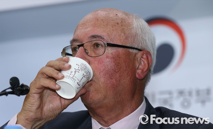 (세종=포커스뉴스) 장 마리 슈발리에 프랑스 파리공항공단자회사 ADPi 수석엔지니어가 21일 오후 세종시 정부세종청사 국토교통부 브리핑실에서 열린 동남권 신공항 타당성 검토 연구 최종 보고회에서 입지선정 결과 발표를 마치고 목을 축이고 있다.