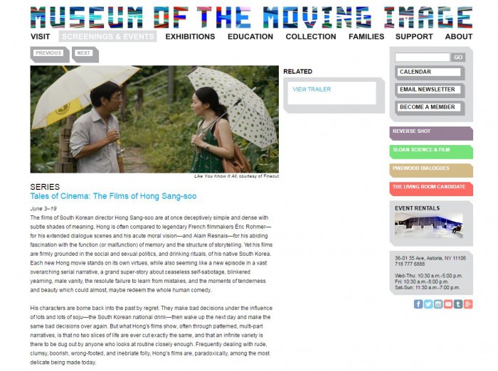 영화 관계자의 말에 따르면 홍상수 감독은 6월 3일부터 19일까지 미국 뉴욕의 뮤지엄 오브 더 무빙 이미지(MoMI)에서 열리는 회고전을 위해 이달 초 미국으로 떠난 것으로 알려졌다.