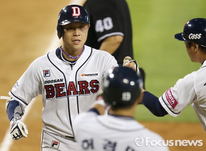 (서울=포커스뉴스) 12일 서울 잠실구장에서 열린 2016 프로야구 kt-두산 경기 4회말 2사 1루에서 두산 박세혁이 우월 2점 홈런을 치고 홈인하고 있다.