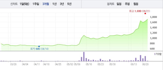 이는 2주 전 주가인 8일(1130원)과 비교했을 때 무려 51.3% 상승한 수치다.