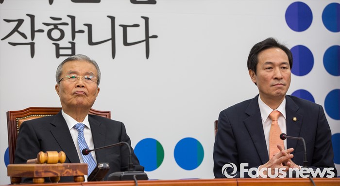 (서울=포커스뉴스) 김종인 더불어민주당 비상대책위 대표와 우상호 원내대표가 22일 오전 서울 여의도 국회에서 열린 비상대책위원회의에 참석 하고 있다.
