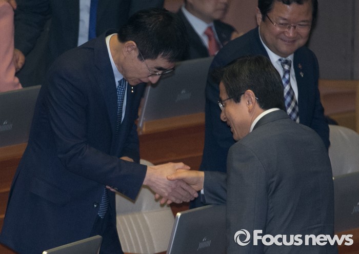 (서울=포커스뉴스) 22일 오전 서울 여의도 국회에서 열린 343회 국회(임시회) 5차 본회의에 참석한 황교안(오른쪽) 국무총리와 이준식 사회부총리 겸 교육부 장관이 인사하고 있다.