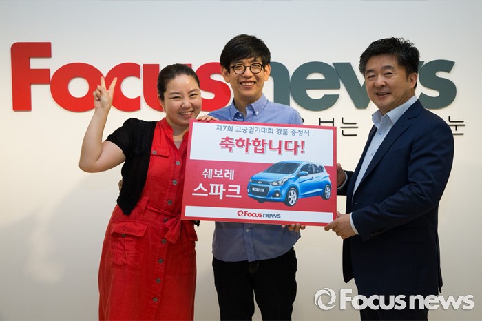 (서울=포커스뉴스) 22일 오전 서울 서초구 포커스뉴스 본사에서한대희 포커스뉴스 대표가 제7회 나라사랑 고궁걷기대회 1등 경품 추첨에 당첨된 이윤옥, 김한준 부부에게 경품을 전달하고 있다.