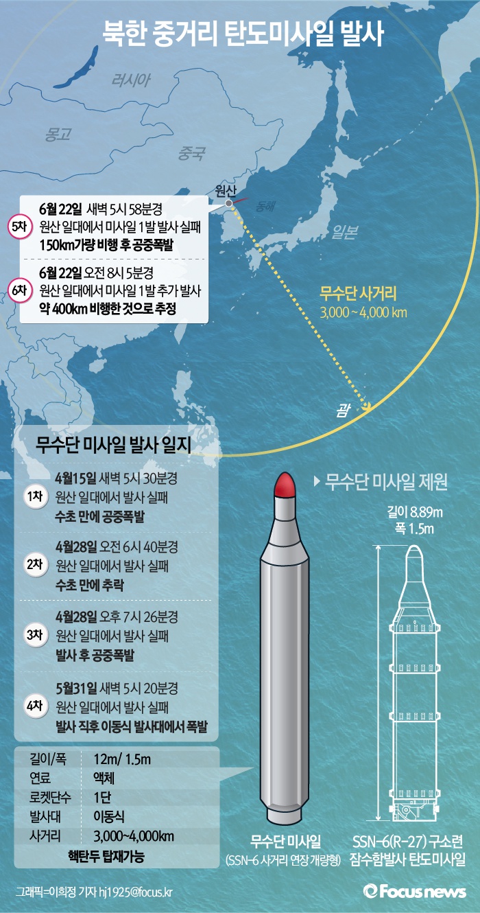 (서울=포커스뉴스) 북한이 22일 오전 무수단 미사일로 추정되는 발사체를 2발 발사했다. 첫 번째 미사일은 150km가량 비행 후 공중폭발해 발사 실패로 추정됐고, 두 번째 발사한 미사일은 약 400km 비행한 것으로 추정됐다. 현재 한국과 미군 당국이 두 번째 미사일의 성공 여부에 대해 정밀 분석 중이다.
