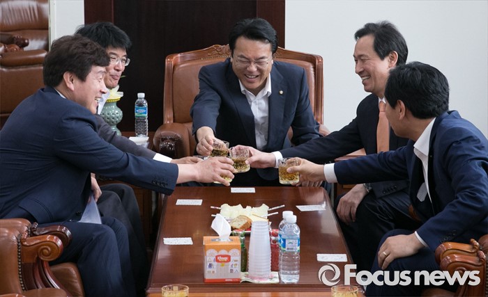 (서울=포커스뉴스) 22일 오전 서울 여의도 국회에서 운영위원회 전체회의를 마친 뒤 정진석 새누리당 원내대표, 우상호 더불어민주당 원내대표 등 의원들이 음료를 마시며 논의 중 건배를 하고 있다. 왼쪽부터 기동민 더불어민주당 원내대변인, 박완주 원내수석부대표, 정진석 새누리당 원내대표, 우상호 더불어민주당 원내대표, 김관영 국민의당 원내수석부대표.