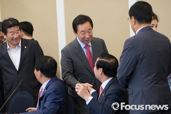 (서울=포커스뉴스)김성태(가운데) 새누리당 의원이 22일 오후 서울 여의도 국회에서 열린 비박계 새누리당 의원들이 주축이 된 '대한민국 미래혁신포럼' 창립 총회에서 동료 의원들과 인사를 나누고 있다.
