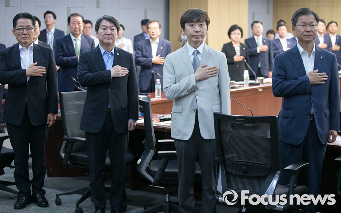 (서울=포커스뉴스) 23일 오전 서울 여의도 국회에서 열린 국민의당 19차 정책역량강화 워크숍에 참석한 천정배(오른쪽부터) 공동대표, 김희삼 광주과학기술원 교수, 안철수 상임공동대표, 박지원 원내대표 등 의원 및 참석자들이 국기에 대한 경례를 하고 있다.