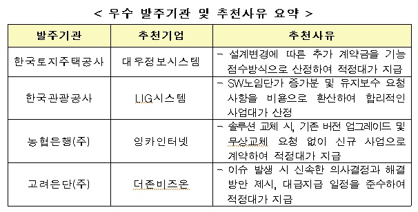 이번에는 한국토지주택공사, 한국관광공사, 농협은행, 고려은단 등 4개 발주기관이 적정한 사업대가 지급, 대금지급 일정 준수 등 SW 제값주기에 모범을 보인 사례로 선정됐다.