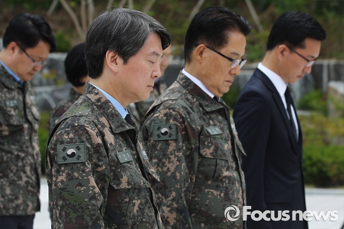 (서울=포커스뉴스) 안철수 국민의당 상임공동대표, 박지원 원내대표 등 의원들이 23일 오전 경기도 평택 해군 제2함대 사령부를 방문해 천안함 앞에서 묵념을 하고 있다.