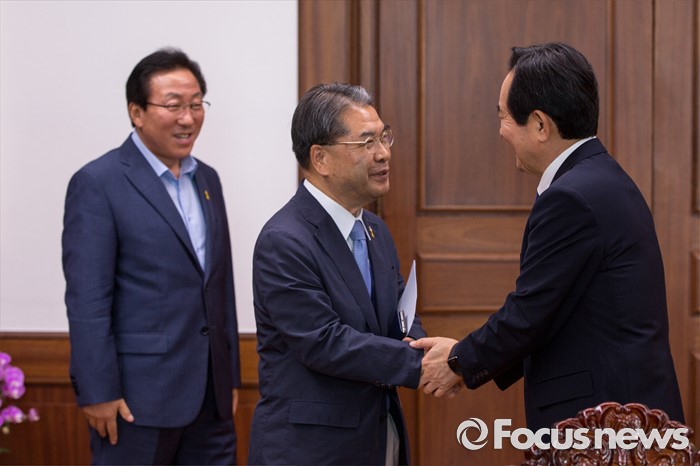 (서울=포커스뉴스) 정세균(오른쪽) 국회의장이 23일 오후 서울 여의도 국회에서 이재정(가운데) 경기도교육감과 면담에 앞서 악수 하고 있다.