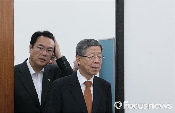 (서울=포커스뉴스) 24일 오전 서울 여의도 국회에서 열린 북한 미사일 발사 관련 국방부 현안보고에 김희옥(오른쪽) 새누리당 혁신비대위원장과 정진석 원내대표가 참석하고 있다.
