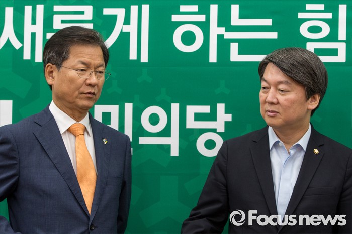 (서울=포커스뉴스) 안철수(오른쪽) 국민의당 상임공동대표와 천정배 공동대표가 24일 오전 서울 여의도 국회에서 황인무 국방부 차관에게 북한 미사일 발사 관련 현안보고 받기 전 대화를 나누고 있다.