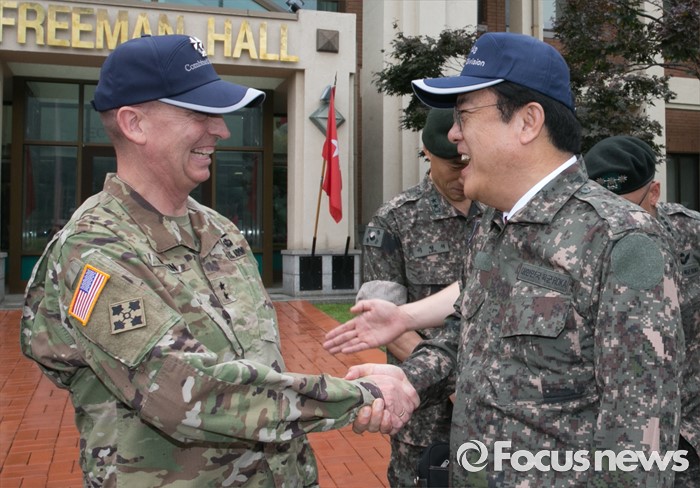 (의정부=포커스뉴스) 정진석(오른쪽) 새누리당 원내대표가 24일 오전 경기도 의정부 미2사단 한미연합사단을 방문해 테드 마틴 미2사단장과 악수하고 있다.