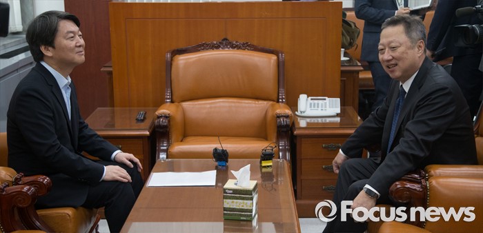 (서울=포커스뉴스) 안철수 국민의당 상임공동대표와 박용만 대한상공회의소 회장이 24일 오전 서울 여의도 국회에서 만나 대화를 나누고 있다.