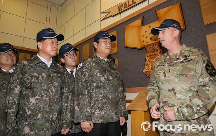 (의정부=포커스뉴스) 정진석 새누리당 원내대표, 김영우 국방위원장 등 의원들이 24일 오전 경기도 의정부 미2사단 한미연합사단을 방문해 테드 마틴 미2사단장으로부터 명예훈장 수여자 패널에 대한 설명을 듣고 있다.