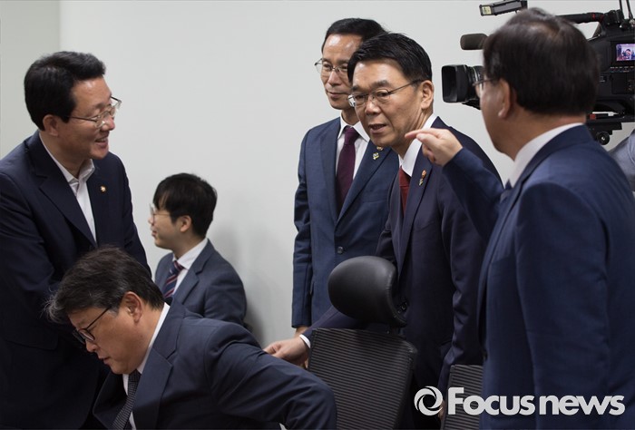 (서울=포커스뉴스) 24일 오후 서울 여의도 국회 의원회관에서 열린 여야 대구지역 의원들과 강호인 국토교통부 장관의 영남권 신공항 백지화 관련 면담에 참석한 강호인(오른쪽 두번째) 장관이 의원들과 인사하고 있다.