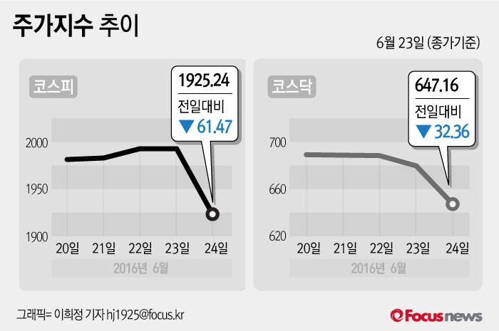 (서울=포커스뉴스) 24일 코스피지수는 전날 보다 3.09%(61.47포인트) 내린 1925.241에 장을 마쳤다. 코스닥지수는 전일 대비 4.76%(32.36포인트) 내린 647.16에 마감했다.