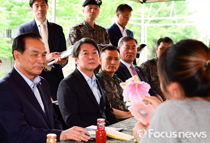 (의정부=포커스뉴스) 안철수(왼쪽 두번째) 국민의당 상임공동대표가 24일 오후 경기도 의정부 56사단의 한 부대를 방문해 군인가족들을 격려하며 애로사항을 듣고 있다.