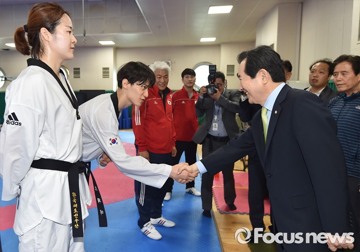 (서울=포커스뉴스) 정세균(오른쪽) 국회의장이 24일 오후 서울 노원구 태릉선수촌을 방문해 브라질 리우 올림픽을 앞두고 훈련 중인 태권도 국가대표 이대훈 선수와 악수하고 있다.