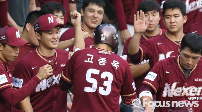 (서울=포커스뉴스) 24일 서울 잠실구장에서 열린 2016 프로야구 넥센-LG 경기 1회초 1사후 넥센 고종욱이 우월 솔로 홈런을 치고 덕아웃에서 동료들의 축하를 받고 있다.