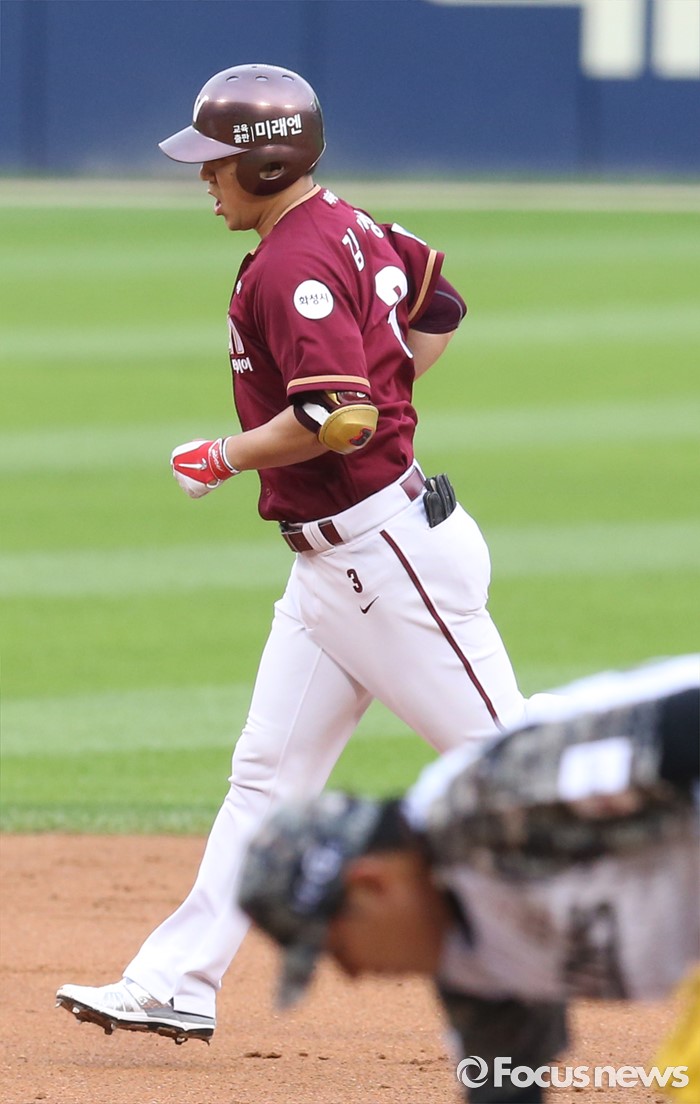 (서울=포커스뉴스) 24일 서울 잠실구장에서 열린 2016 프로야구 넥센-LG 경기 1회초 2사 1,3루에서 넥센 김민성이 좌월 3점 홈런을 치고 베이스를 돌고 있다.