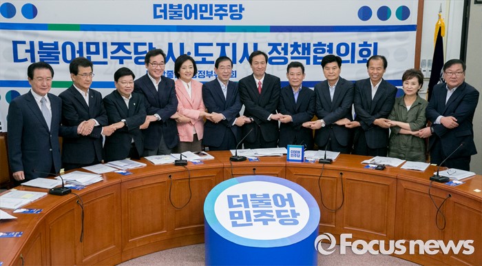 (서울=포커스뉴스) 26일 오전 서울 여의도 국회에서 열린 더불어민주당 시도지사 정책협의회에 참석한 단체장 및 의원들이 취재진을 향해 포즈를 취하고 있다. 왼쪽부터 변재일 정책위의장, 이시종 충북도지사, 권선택 대전시장, 이낙연 전남도지사, 박영선 참좋은지방정부위원회 공동위원장, 박원순 서울시장, 우상호 원내대표, 윤장현 광주시장, 이춘희 세종시장, 최문순 강원도지사, 김현미 예산결산특별위원장, 김태년 예결위 더민주 간사.