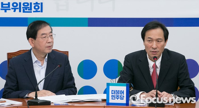 (서울=포커스뉴스) 26일 오전 서울 여의도 국회에서 열린 더불어민주당 시도지사 정책협의회에 참석한 우상호 원내대표가 모두발언을 하고 있다. 왼쪽은 참좋은지방정부위원회 공동위원장인 박원순 서울시장.