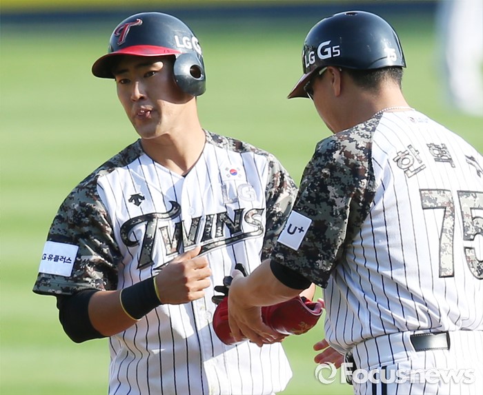 (서울=포커스뉴스) 26일 서울 잠실구장에서 열린 2016 프로야구 넥센-LG 경기 2회말 2사 2,3루에서 LG 정주현이 2타점 2루타를 치고 한혁수 코치의 축하를 받고 있다.
