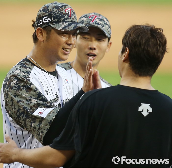 (서울=포커스뉴스) 26일 서울 잠실구장에서 열린 2016 프로야구 넥센-LG 경기 9회초 2사 만루에서 넥센 임병욱을 삼진 아웃시키며 승리를 지킨 LG 신승현이 승리투수 류제국과 하이파이브하고 있다.