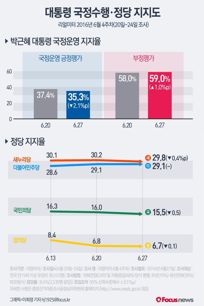 (서울=포커스뉴스) 여론조사 기관 리얼미터의 2016년 6월 4주차 주간집계에 따르면 박근혜 대통령의 국정수행 지지율은 지난주보다 2.1%포인트 하락했다. 반면 부정평가는 지난주보다 1.0%p 상승해 59.0%로 나타났다. 정당별 지지도는 새누리당과 국민의당이 하락세를 보였다.
