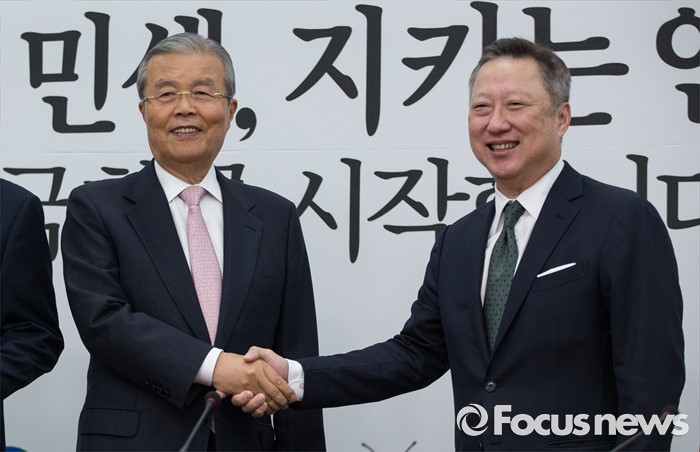 (서울=포커스뉴스) 김종인(왼쪽) 더불어민주당 비상대책위원회 대표가 28일 오전 서울 여의도 국회에서 박용만 대한상공회의소 회장과 인사하고 있다.