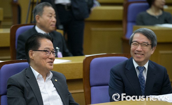 (서울=포커스뉴스) 28일 오전 서울 여의도 국회 의원회관에서 열린 '한국적 제3의 길' 창립 기념 초청 강연, '한국경제와 20대 국회가 가야할 길'에 참석한 정운찬(오른쪽) 동반성장연구소 이사장과 박지원 국민의당 원내대표가 대화하고 있다.
