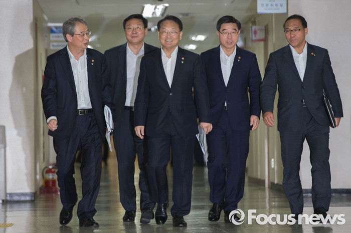 (서울=포커스뉴스) 유일호(사진중앙) 경제부총리가 28일 오후 정부의 추경 등 하반기 경제정책방향을 발표하기 위해 서울 종로구 정부서울청사 브리핑룸으로 들어서고 있다.