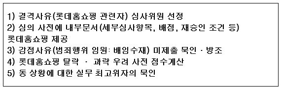또 롯데홈쇼핑은 2014년 3~6월 홈쇼핑 런칭과 황금시간대 광고 편성 등을 명목으로 납품업체 등으로부터 리베이트를 받거나 회삿돈을 빼돌린 혐의가 적발돼 신헌 전 대표를 비롯한 7명이 구속됐으며 전‧현직 상품기획자(MD) 3명이 불구속 기소됐다. 하지만 지난해 4월 재승인 심사를 받기 위해 작성한 사업계획서에서는 배임수재 혐의로 형사처벌을 받은 임직원이 6명이라고 미래부에 축소 보고했다.