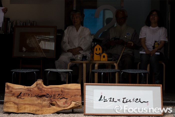 (서울=포커스뉴스) 28일 오전 서울 종로구 류가헌 갤러리에서 백기완 통일문제연구소 소장과 문정현 신부가 '시대의 2인전 두 어른' 기자간담회에 참석해 취재진의 질문에 답하는 가운데 작품이 놓여져 있다.