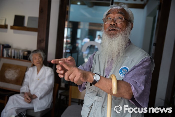 (서울=포커스뉴스) 28일 오전 서울 종로구 류가헌 갤러리에서 백기완(왼쪽) 통일문제연구소 소장과 문정현 신부가 '시대의 2인전 두 어른' 기자간담회에 참석해 취재진의 질문에 답하고 있다.