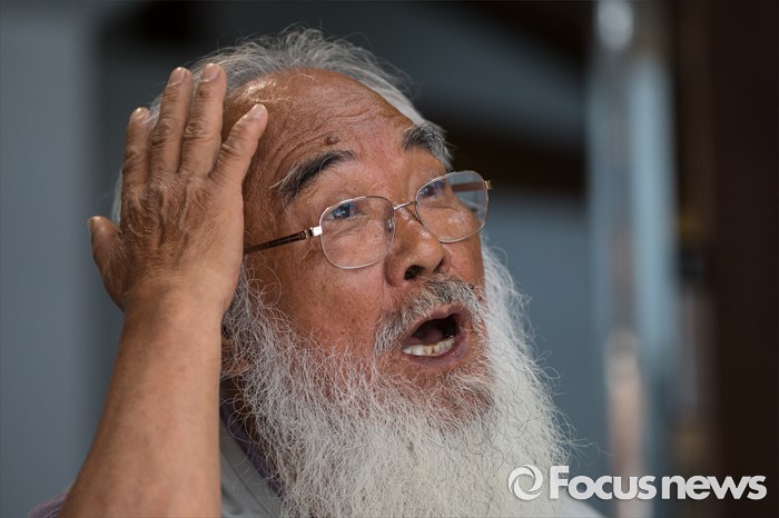(서울=포커스뉴스) 28일 오전 서울 종로구 류가헌 갤러리에서 문정현 신부가 '시대의 2인전 두 어른' 기자간담회에 참석해 취재진의 질문에 답하고 있다.