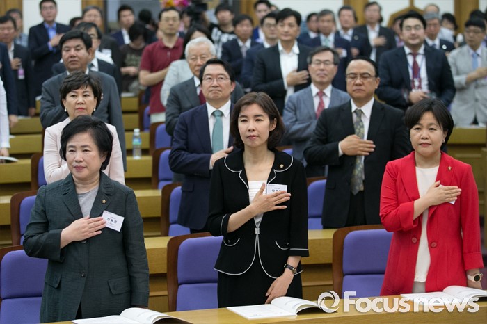 (서울=포커스뉴스) 28일 오후 서울 여의도 국회 의원회관에서 열린 4차 산업혁명포럼 창립총회에 참석한 송희경(앞줄 오른쪽부터) 새누리당 의원, 박경미 더불어민주당 의원, 신용현 국민의당 의원 등 의원 및 참석자들이 국기에 대한 경례를 하고 있다. 이날 창립한 포럼은 여야 3당 비례대표 1번인 송희경 새누리당 의원, 박경미 더불어민주당 의원, 신용현 국민의당 의원을 주축으로 구성된 포럼이다.