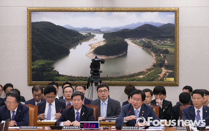 (서울=포커스뉴스) 28일 오후 서울 여의도 국회에서 열린 농림축산식품해양수산위원회 전체회의에 참석한 김영석(오른쪽 두번째) 해양수산부 장관이 의원들의 질의에 답하고 있다.