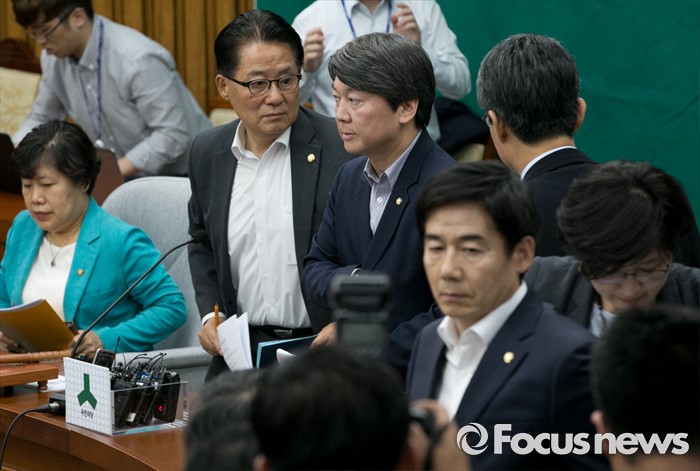 (서울=포커스뉴스) 28일 오후 서울 여의도 국회에서 리베이트 의혹에 연루된 박선숙, 김수민 의원과 왕주현 전 사무부총장 징계수위 등 논의를 위한 국민의당 의원총회를 마친 안철수 상임공동대표, 박지원 원내대표가 퇴장하고 있다.