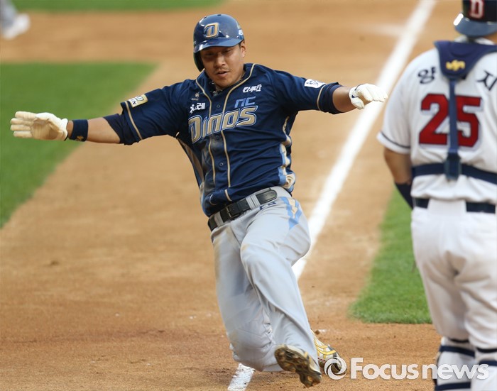 (서울=포커스뉴스) 28일 서울 잠실구장에서 열린 2016 프로야구 NC-두산 경기 4회초 무사 만루에서 NC 용덕한의 3루 땅볼때 3루주자 조영훈이 홈인하고 있다.