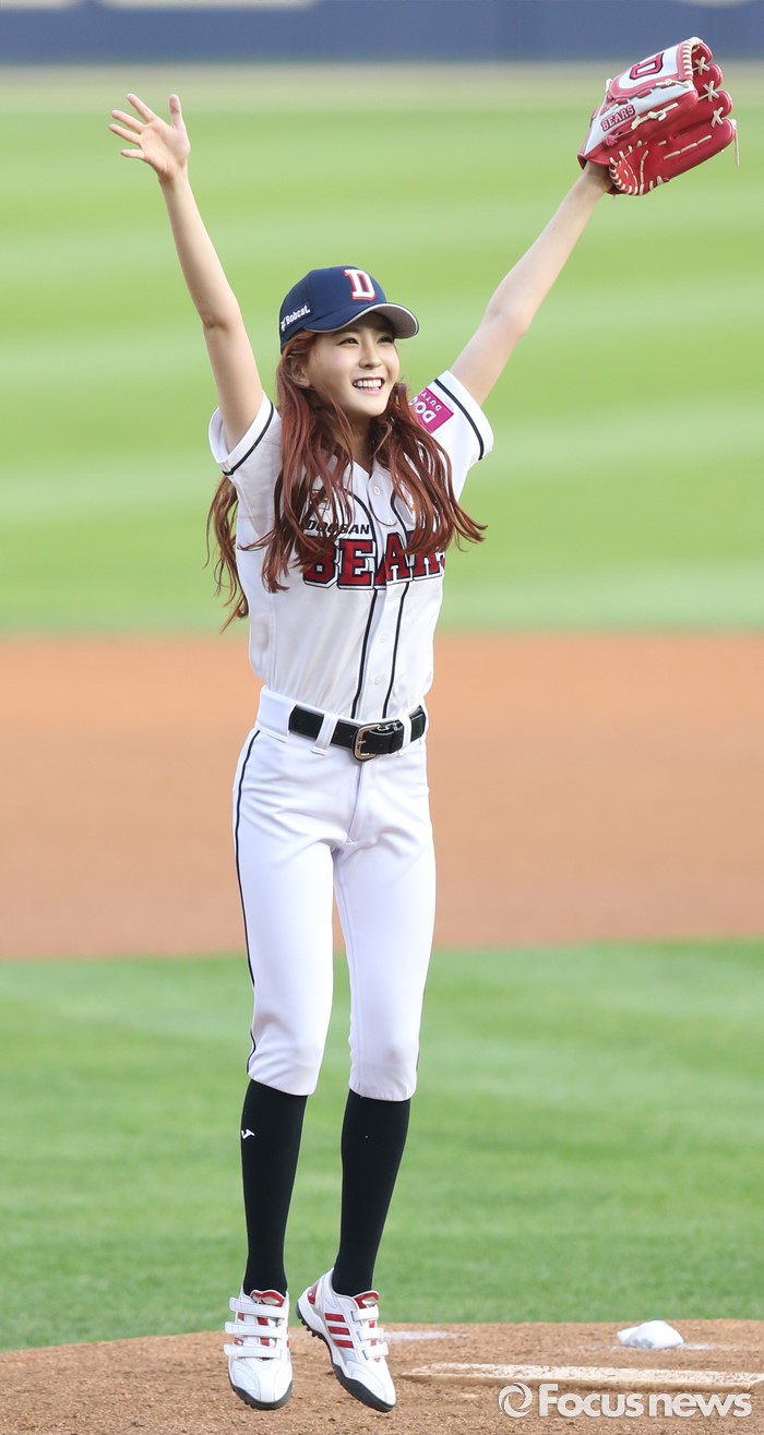 (서울=포커스뉴스) 28일 서울 잠실구장에서 열린 2016 프로야구 NC-두산 경기에서 걸그룹 소나무의 나현이 시구를 성공리에(?) 마치고 마운드에서 펄쩍 뛰며 기뻐하고 있다.